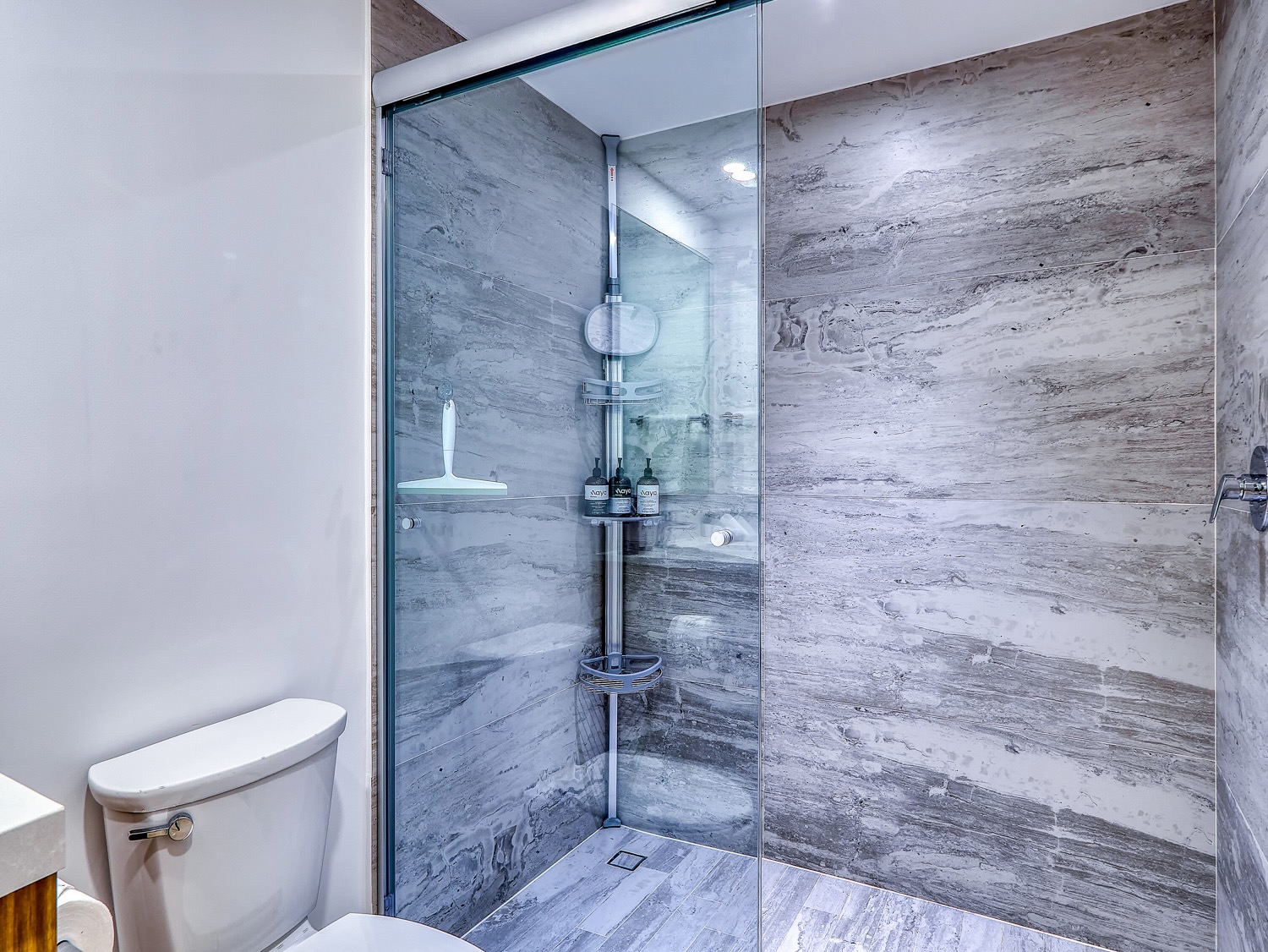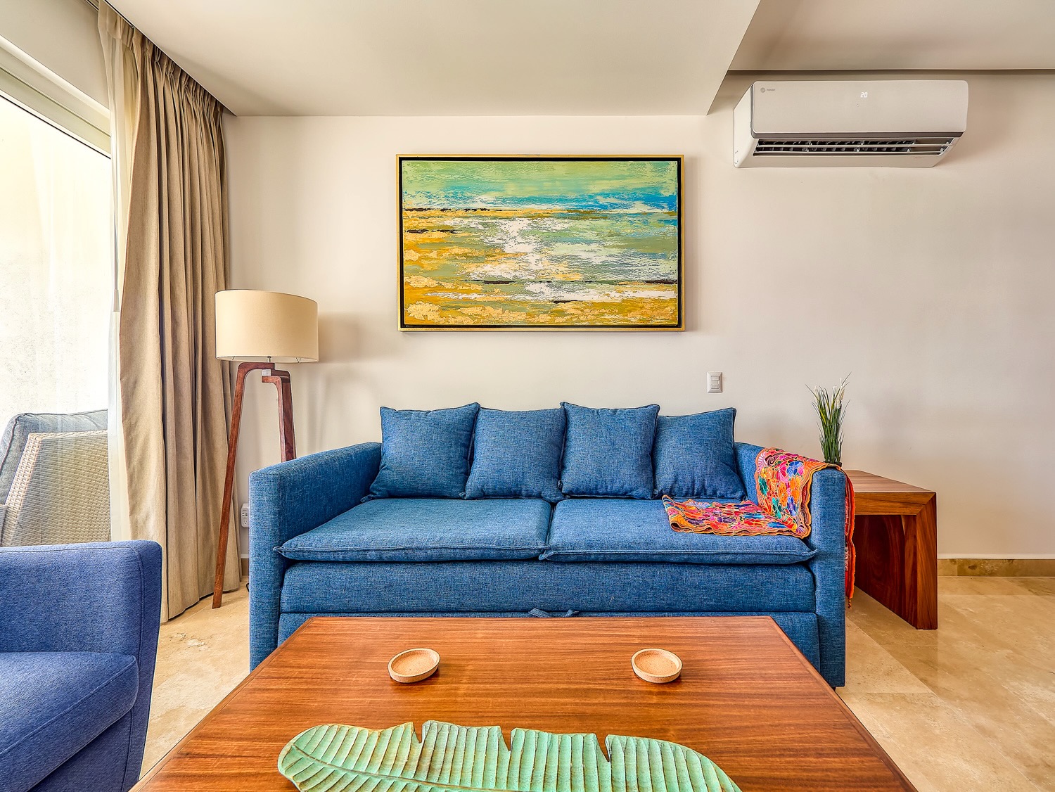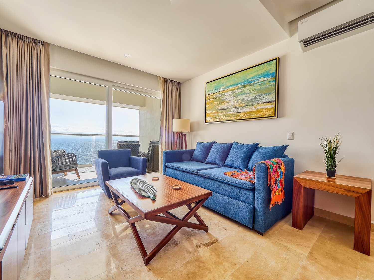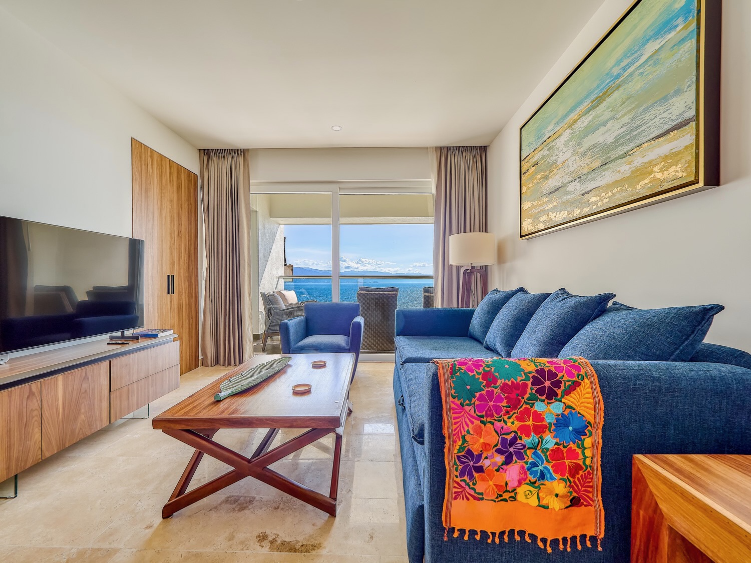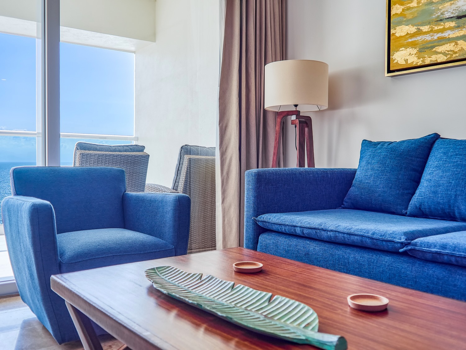 The living room of the condo is designed for both comfort and functionality, featuring a king-size sofa that opens into a spacious sleeper, a large-screen smart TV, and a swivel chair perfect for relaxation or conversation. With stunning ocean views visible from the living area, the space offers a serene and inviting atmosphere. A fully equipped bathroom with a modern shower and thoughtful amenities ensures convenience, while a closet with drawers and shelf space provides ample storage for your belongings.