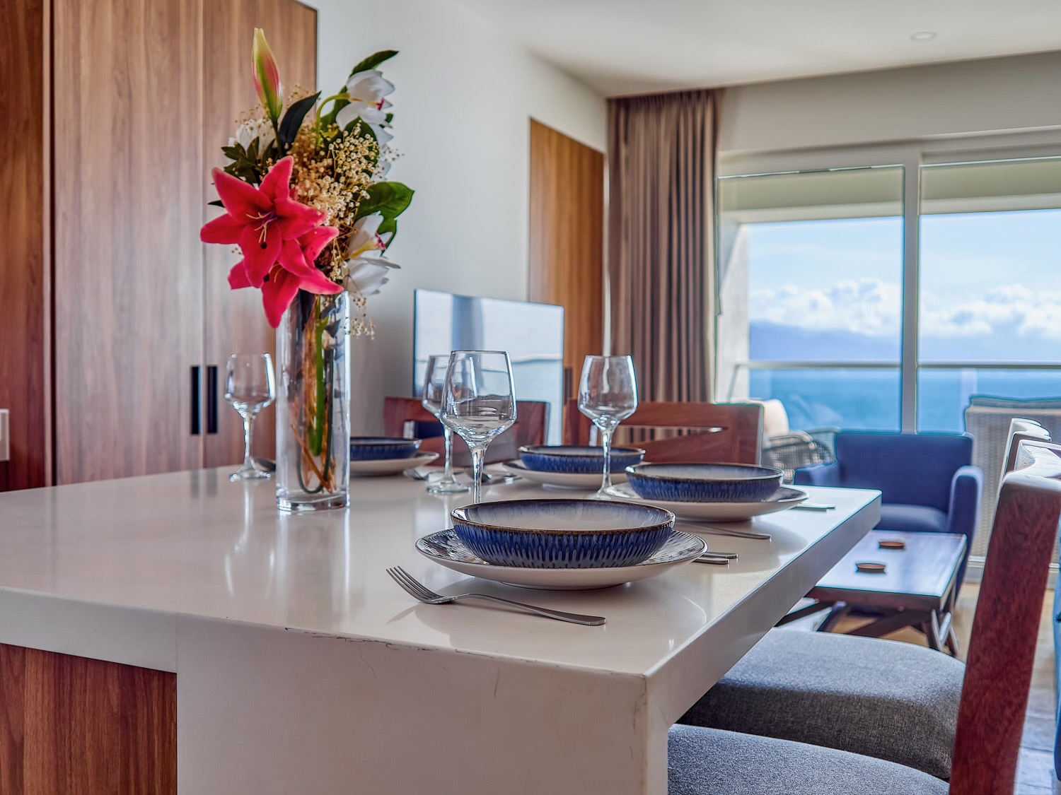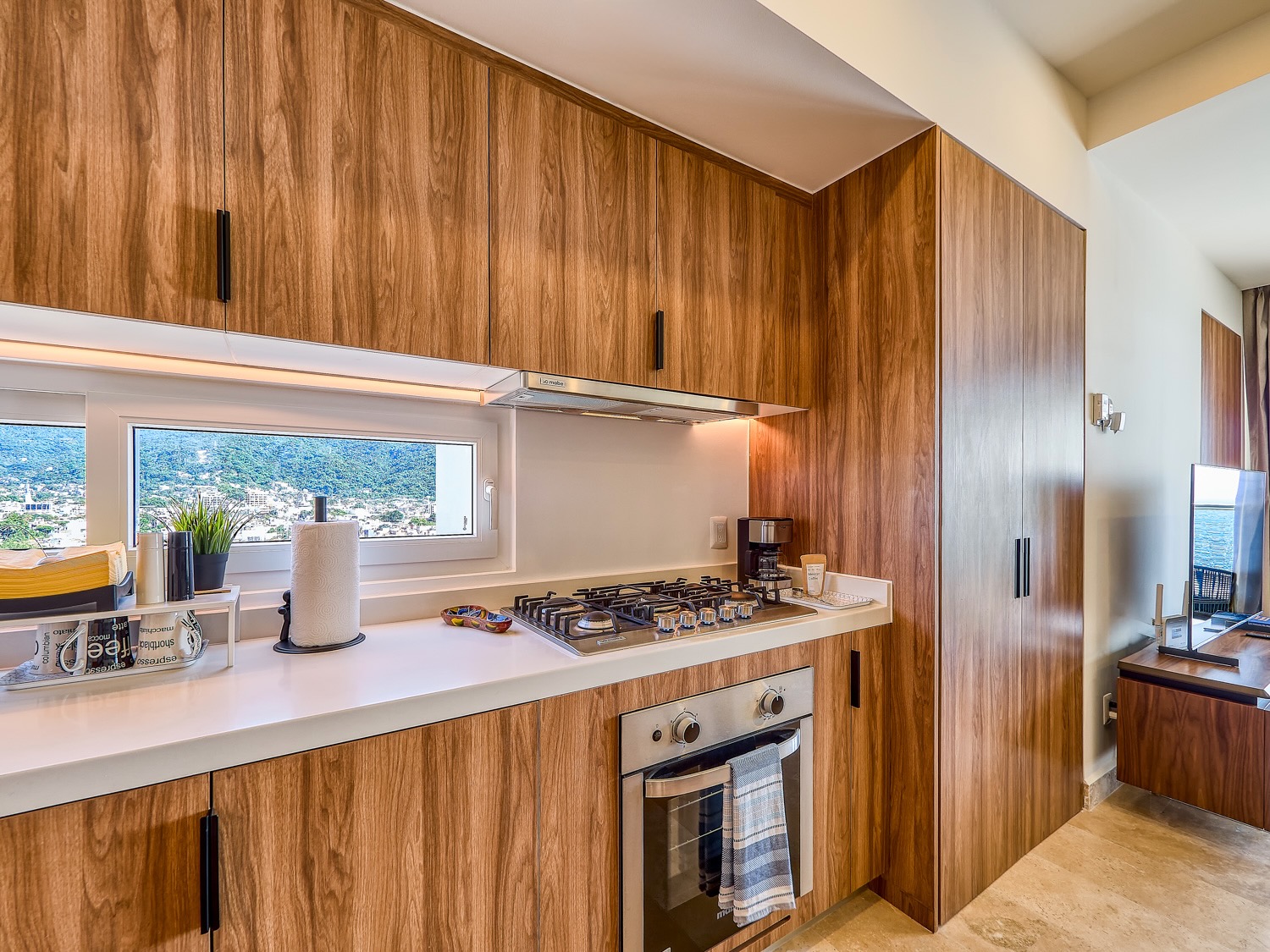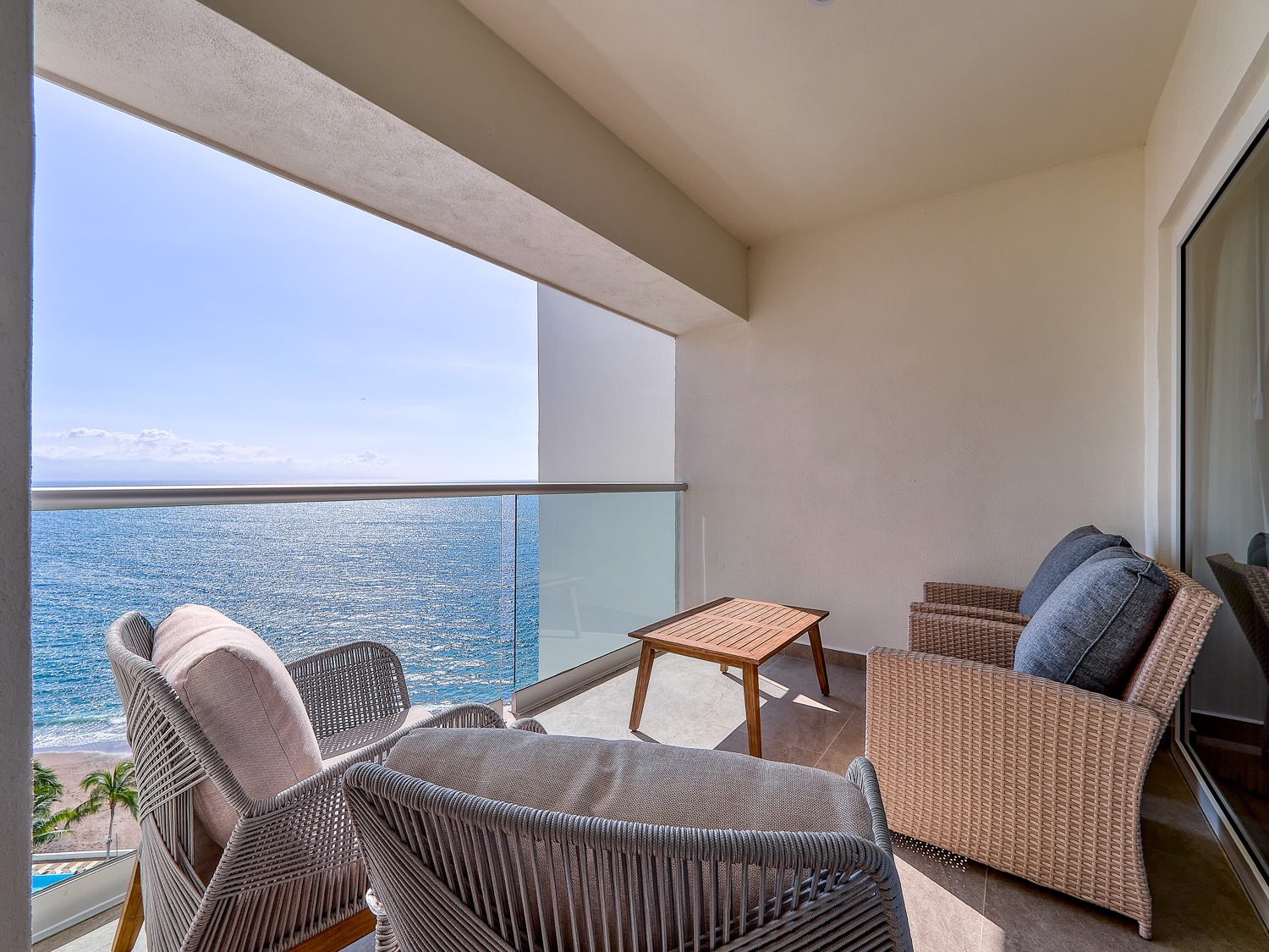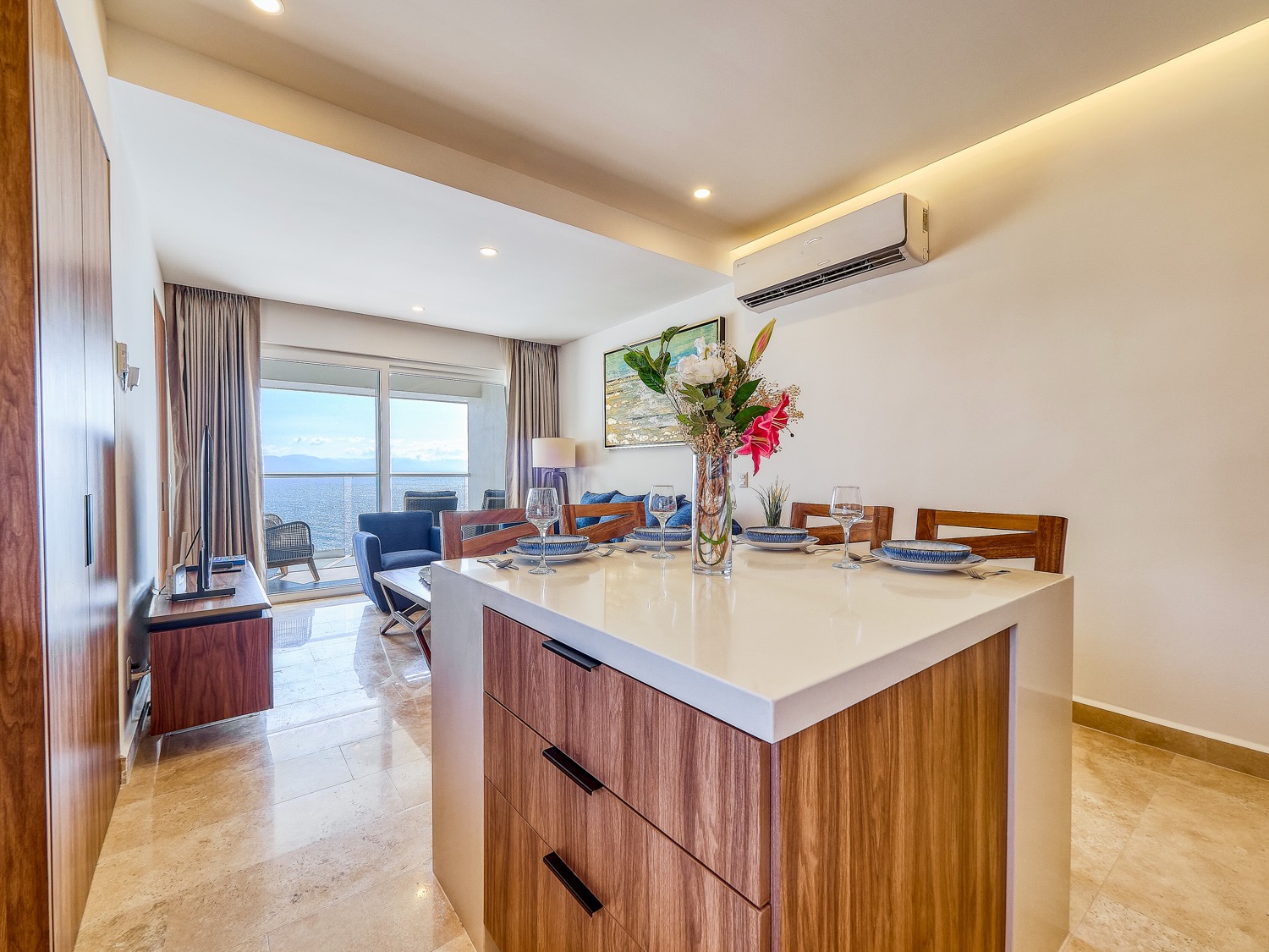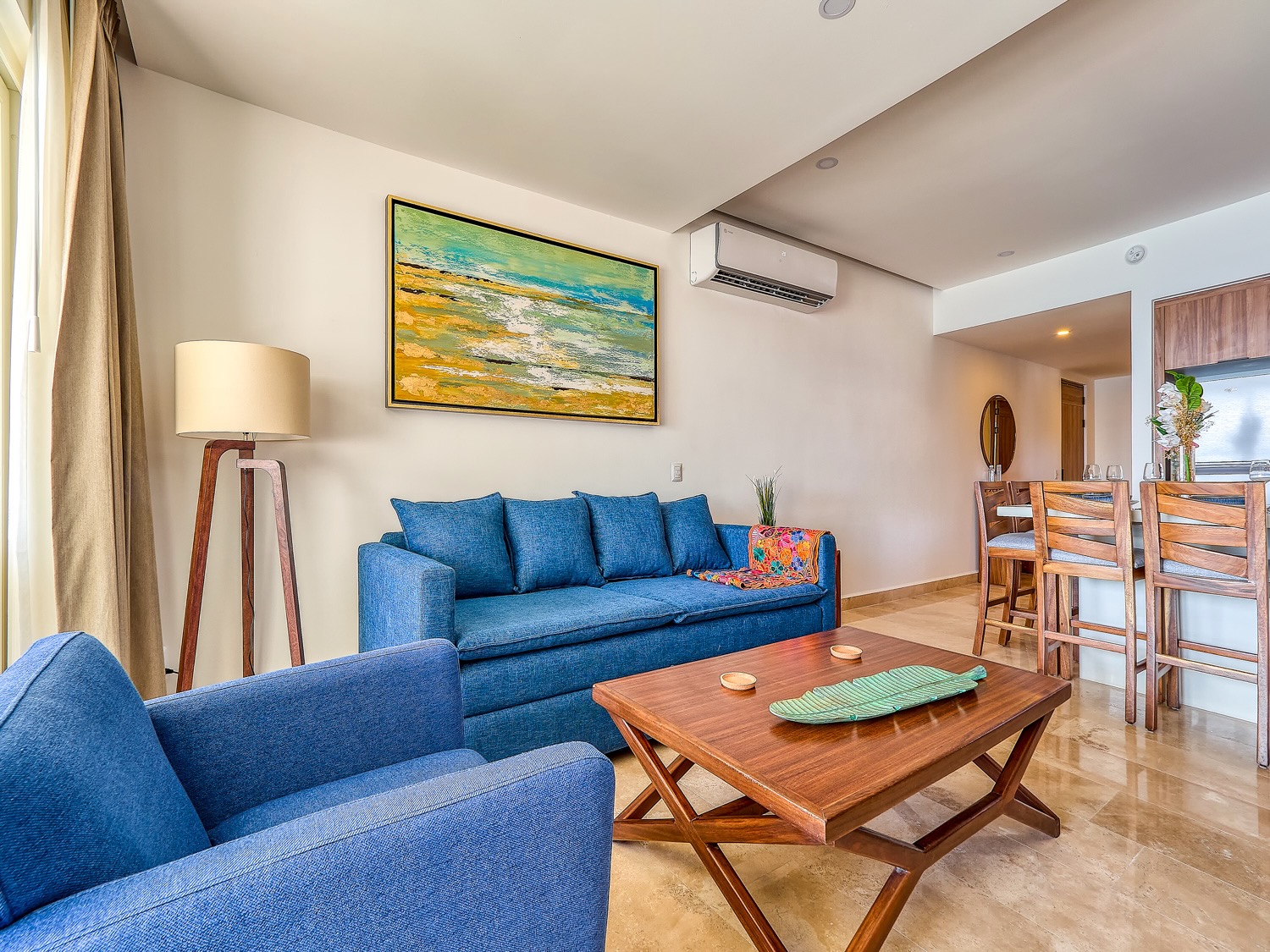 The living room of the condo is designed for both comfort and functionality, featuring a king-size sofa that opens into a spacious sleeper, a large-screen smart TV, and a swivel chair perfect for relaxation or conversation. With stunning ocean views visible from the living area, the space offers a serene and inviting atmosphere. A fully equipped bathroom with a modern shower and thoughtful amenities ensures convenience, while a closet with drawers and shelf space provides ample storage for your belongings.
