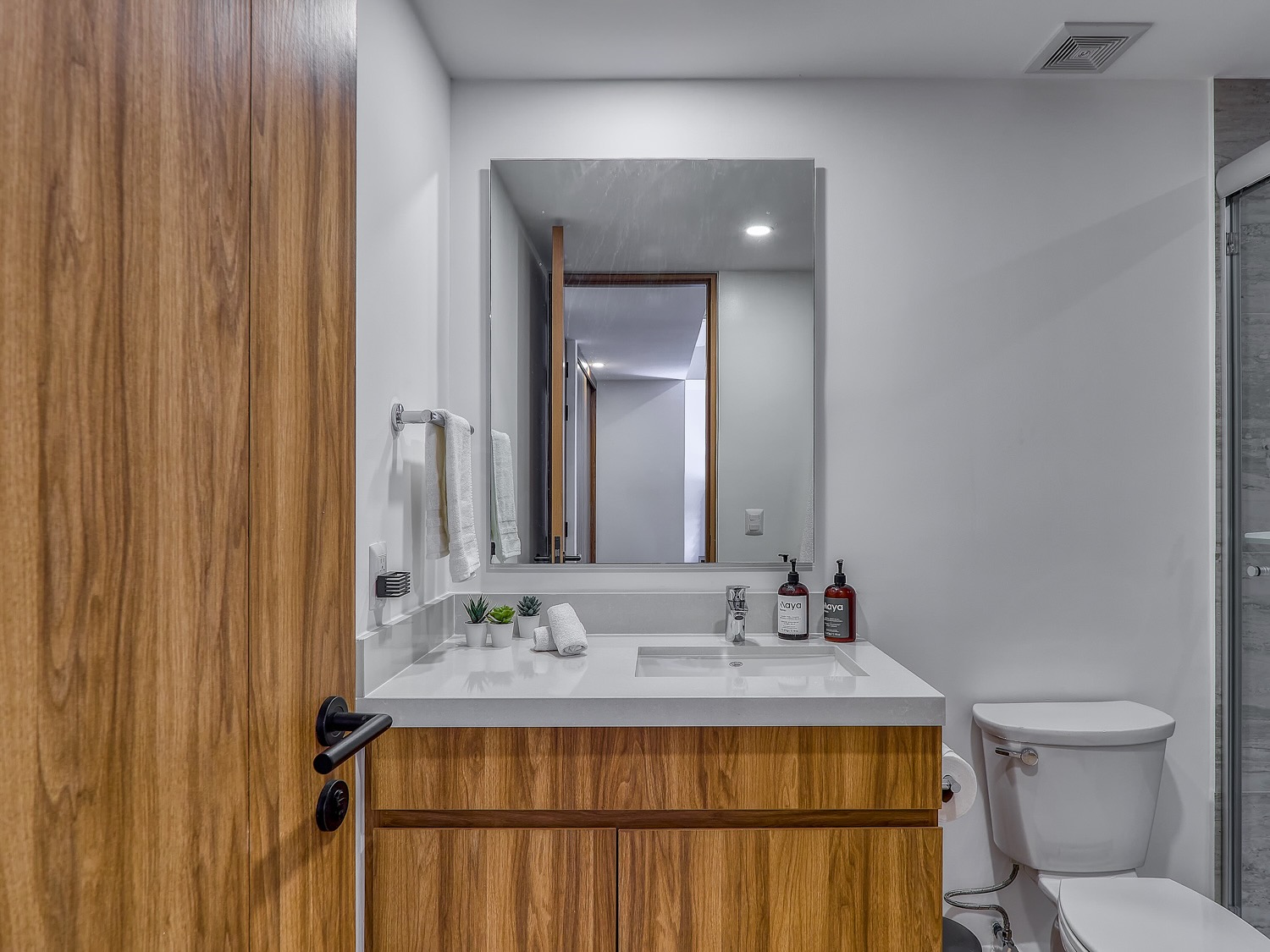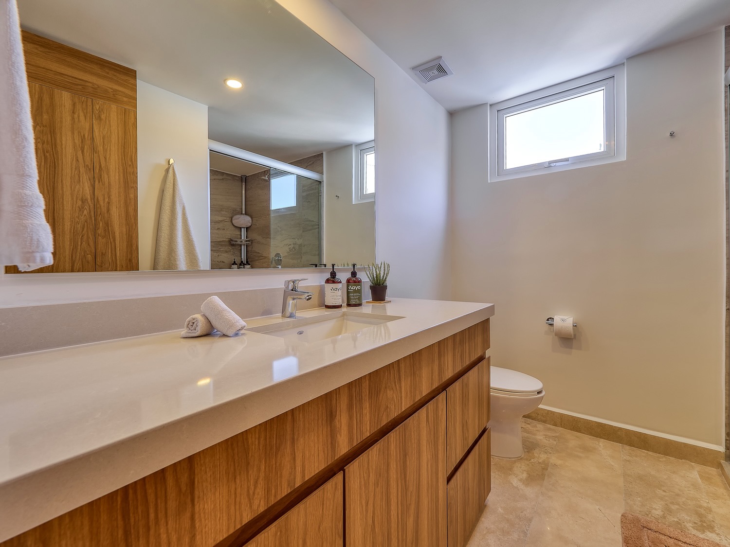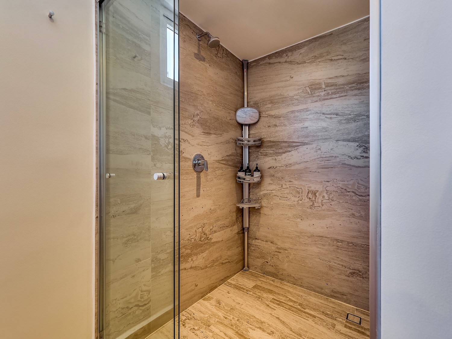 The bedroom also includes an attached bathroom with a modern shower and thoughtful amenities, making it a warm and inviting retreat.
