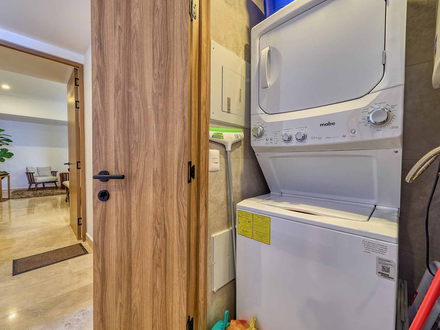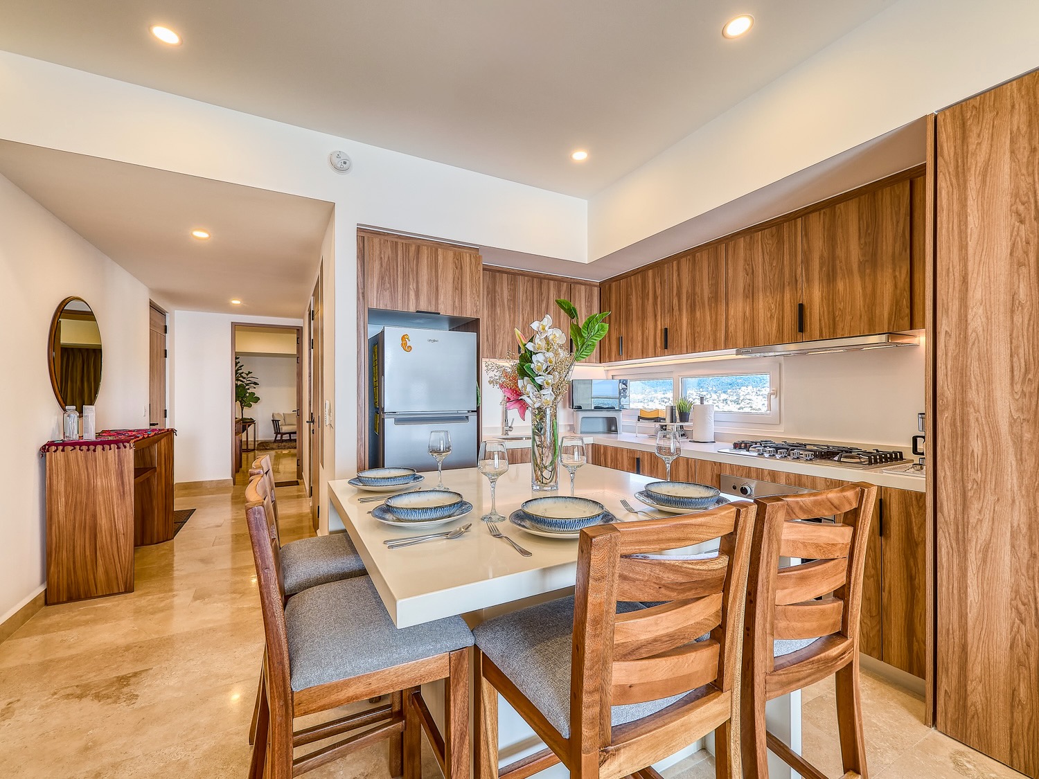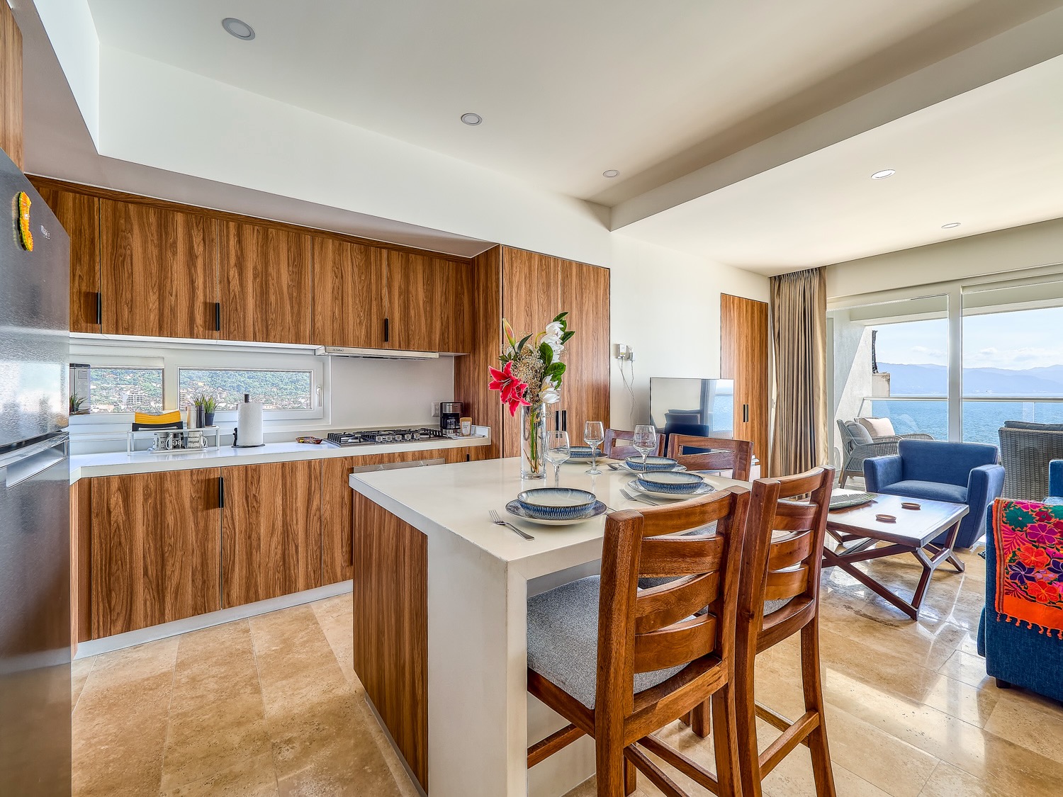 The kitchen is fully equipped with a full-size fridge, a coffee maker, and all the necessary cutlery, dishes, and utensils for your convenience. It features ample counter space and a central counter with four high chairs, making it perfect for casual dining or enjoying your morning coffee. Also included a washer and dryer.