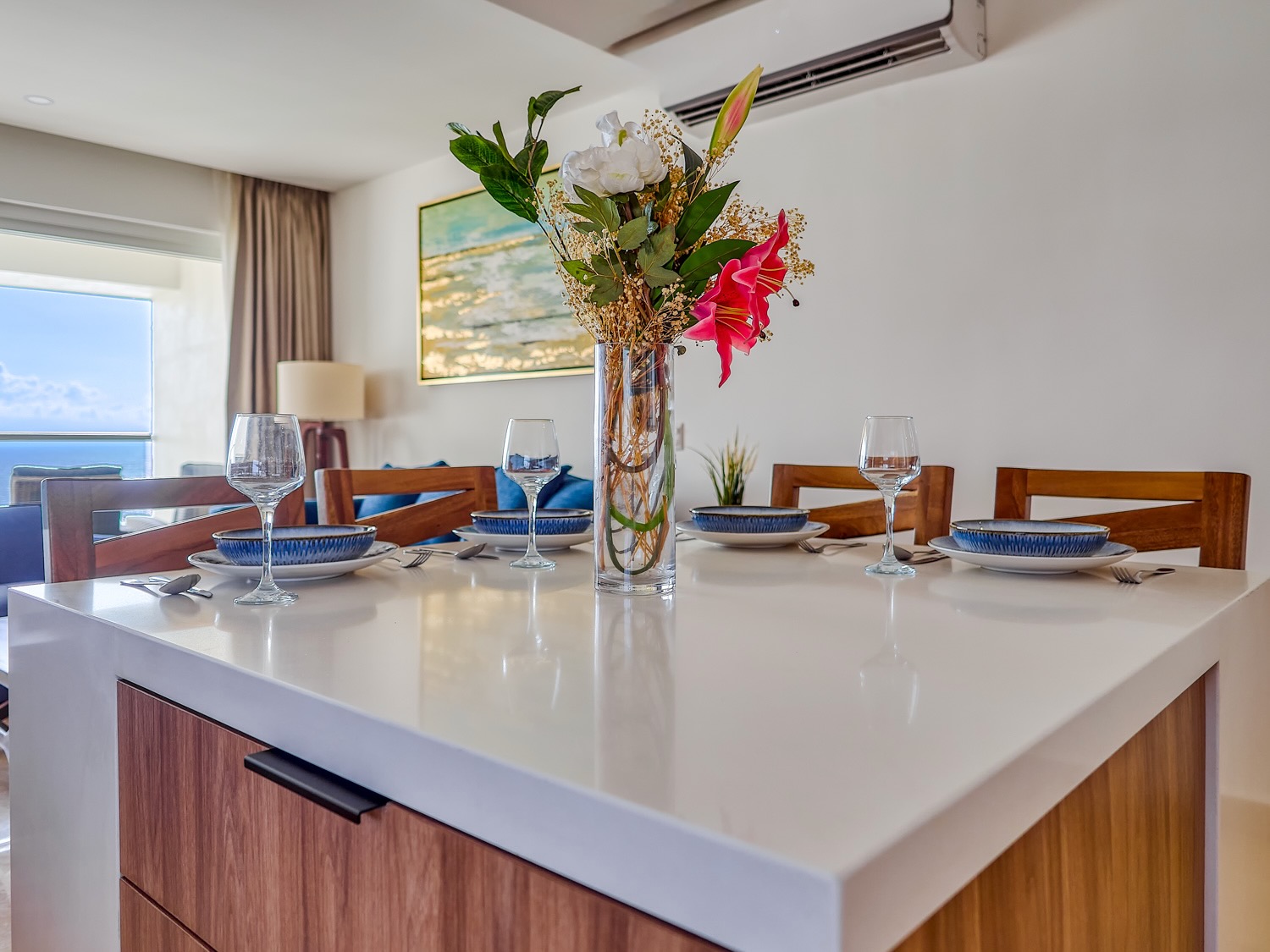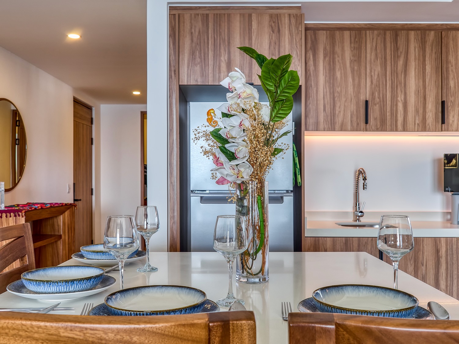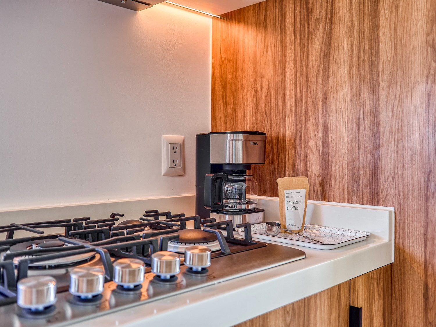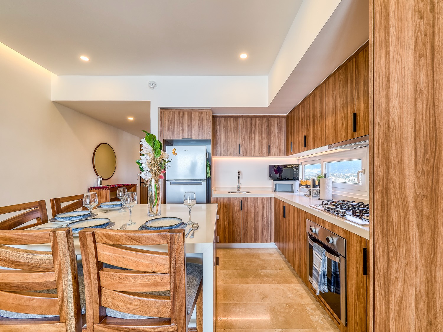 The kitchen is fully equipped with a full-size fridge, a coffee maker, and all the necessary cutlery, dishes, and utensils for your convenience. It features ample counter space and a central counter with four high chairs, making it perfect for casual dining or enjoying your morning coffee. Also included a washer and dryer.