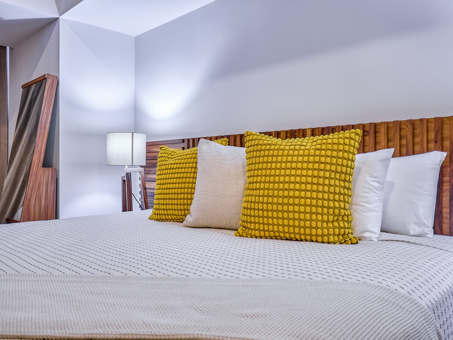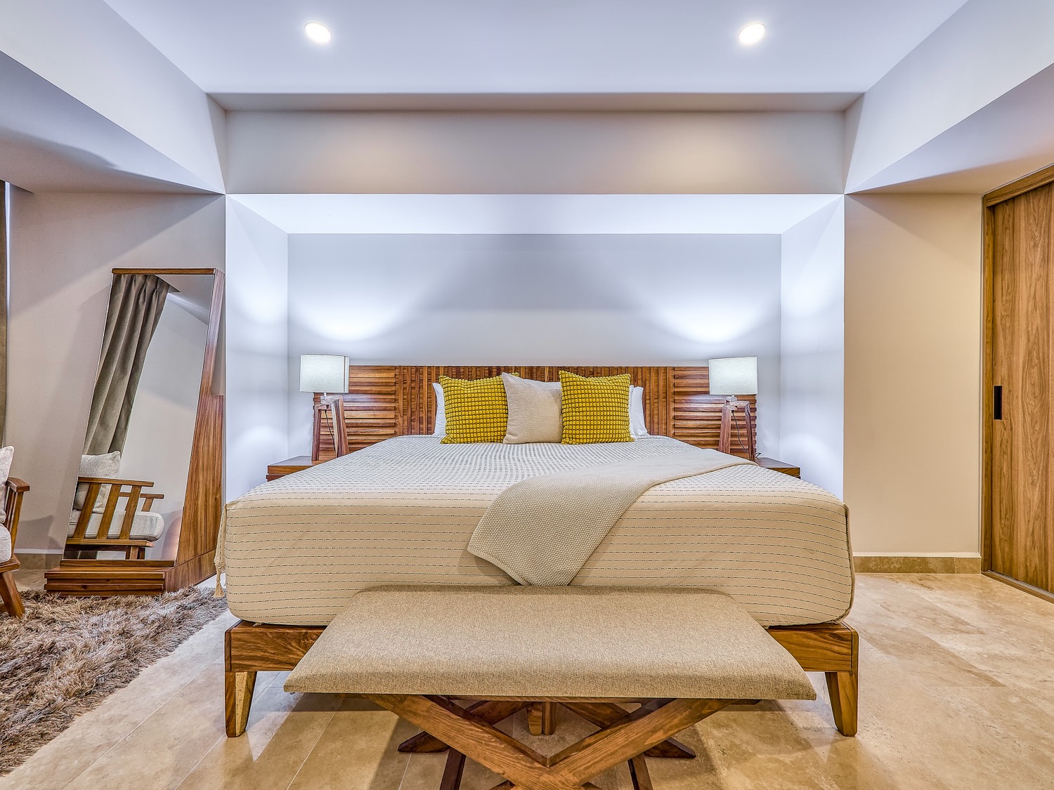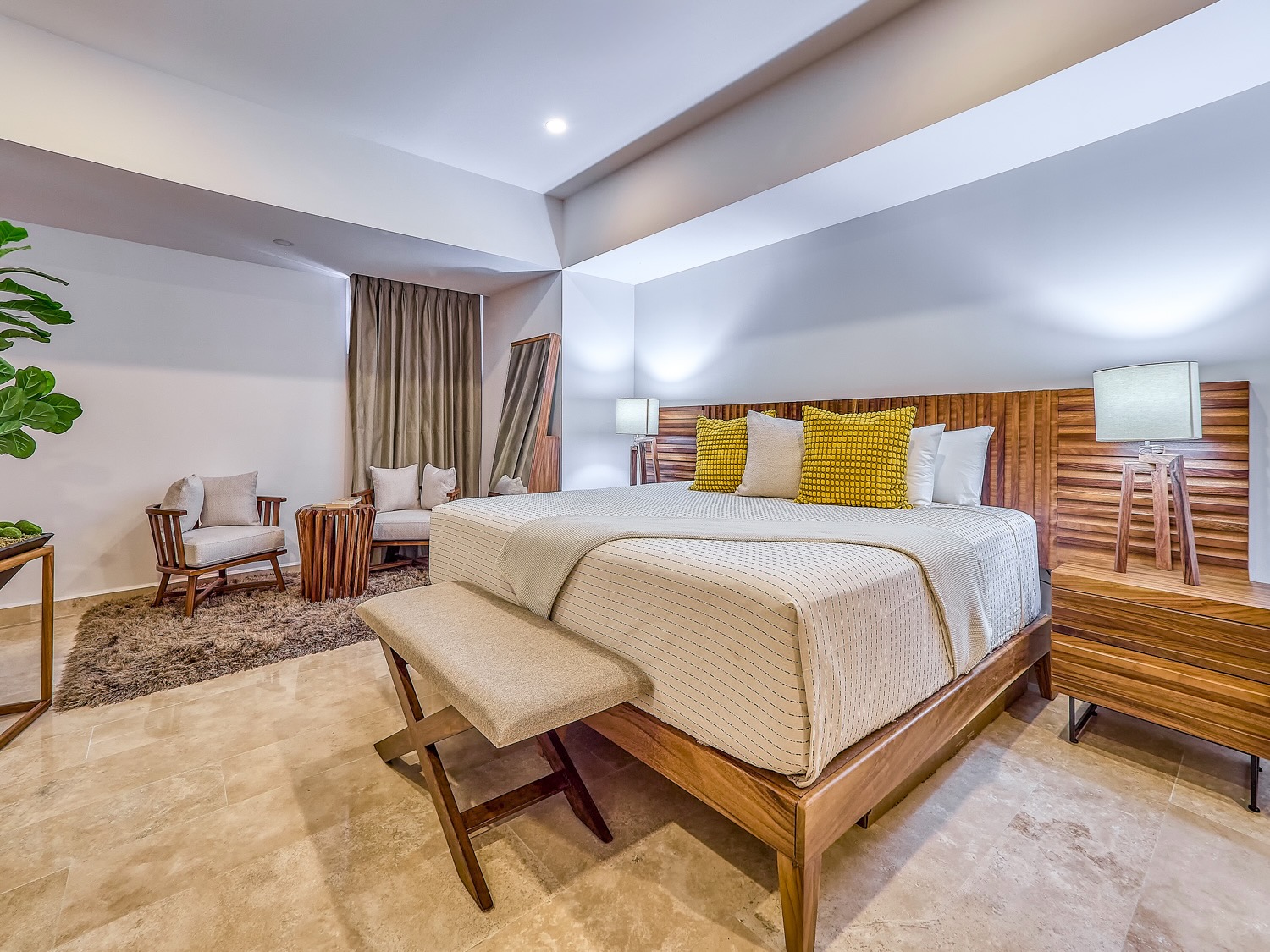 This modern bedroom space offers a comfortable space, featuring luxurious bedding, ambient lighting, elegant furnishings and soft neutral tones. Designed for relaxation, it combines practicality with a touch of elegance, creating a cozy and inviting atmosphere. The bedroom also  features a cozy sitting area with two comfortable chairs, a small table, and a plush carpet, perfect for relaxing or enjoying a quiet moment. The space is thoughtfully designed for comfort and convenience, offering a warm and inviting atmosphere.