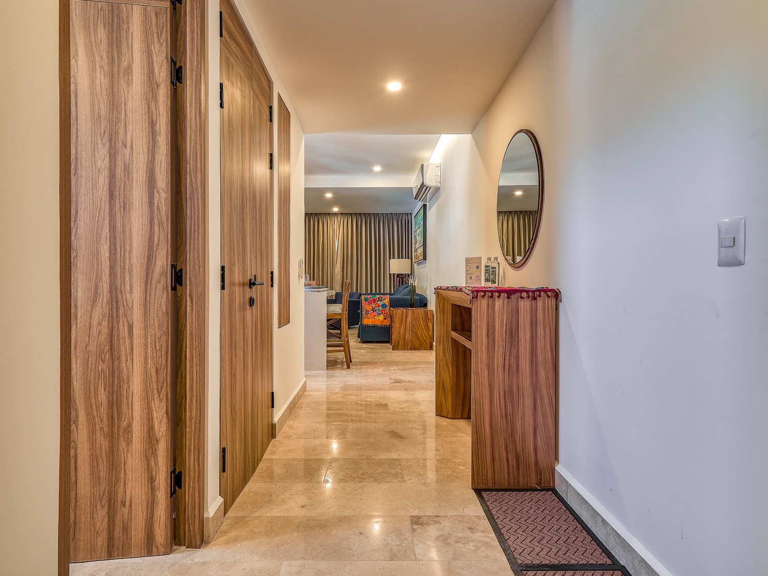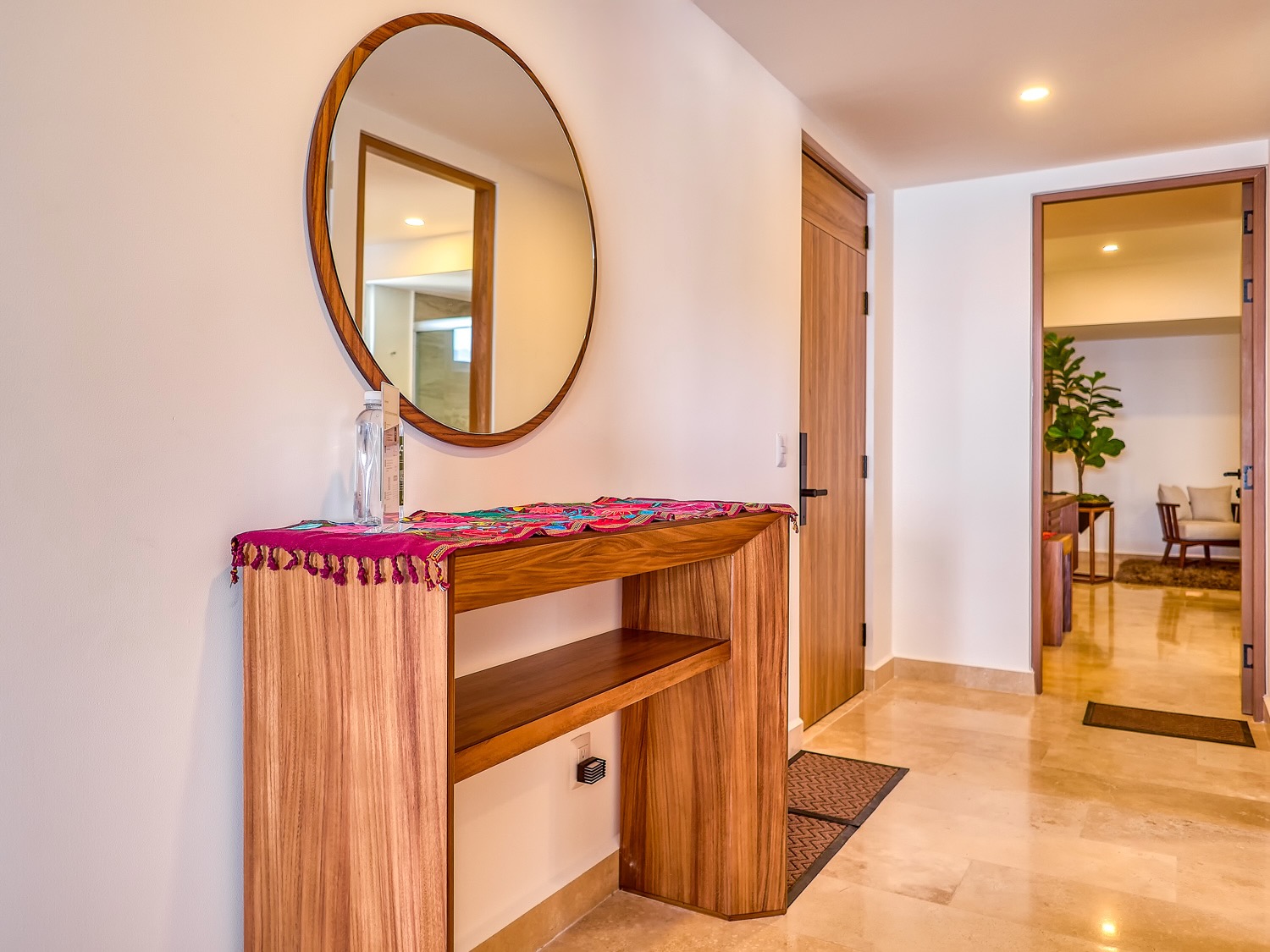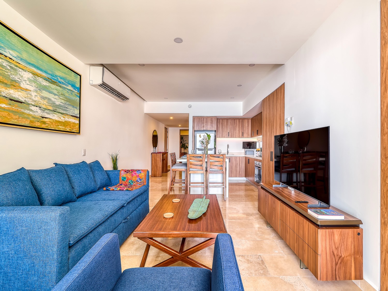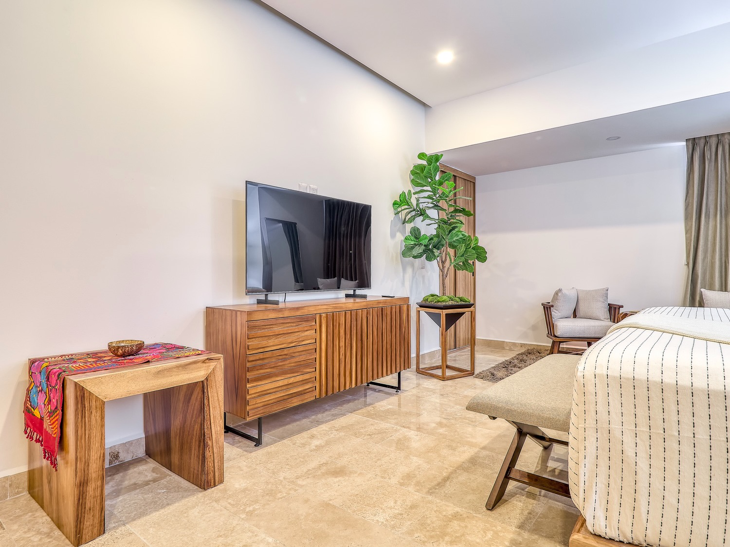 The bedroom is equipped with a large-screen modern TV, perfect for unwinding with your favorite shows or movies. The large-screen TV makes it perfect for unwinding after a day by the ocean.
